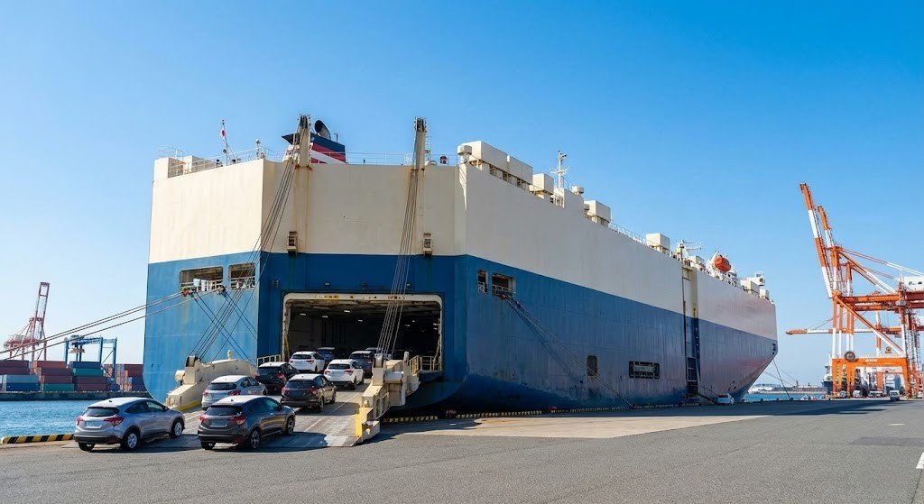 our vehicle's safety during the voyage is paramount. Inside the massive RORO vessels, cars are driven to designated decks, parked securely, and lashed down to prevent movement, completely protected from saltwater and weather elements.